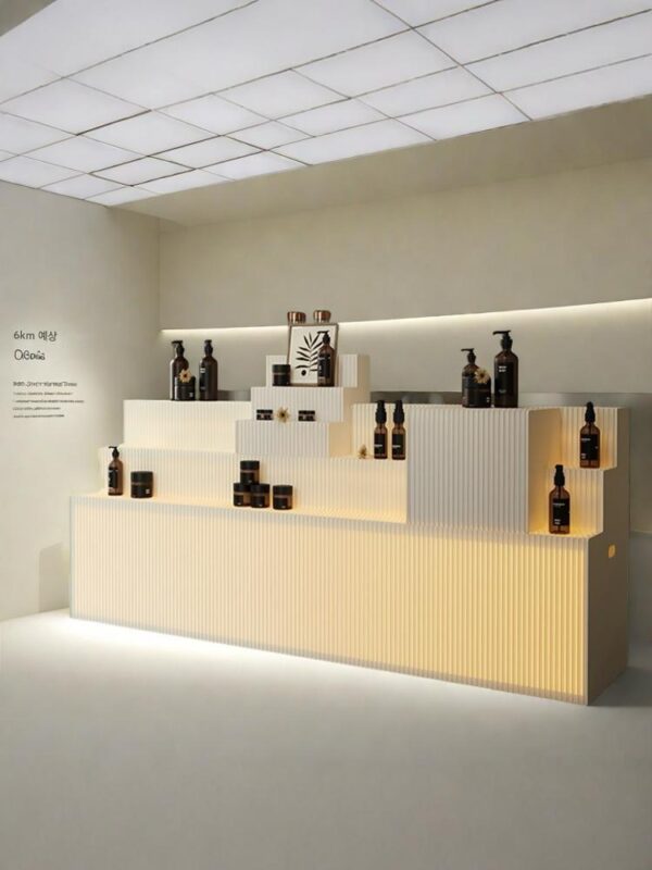 매장 쇼룸, 다기능 계산대 프런트 데스크, 페인트 튜브 스포트라이트, 디스플레이 캐비닛 맞춤형을 위한 맞춤형 원형 섬형 디스플레이 스탠드