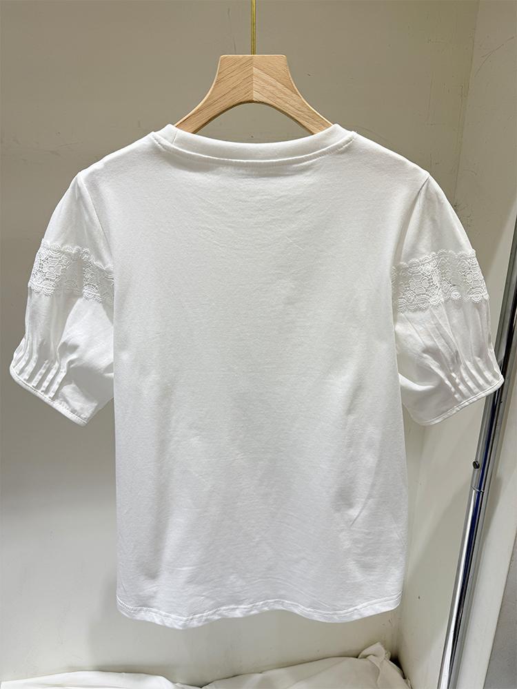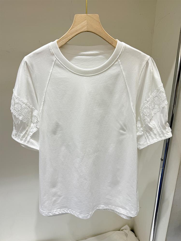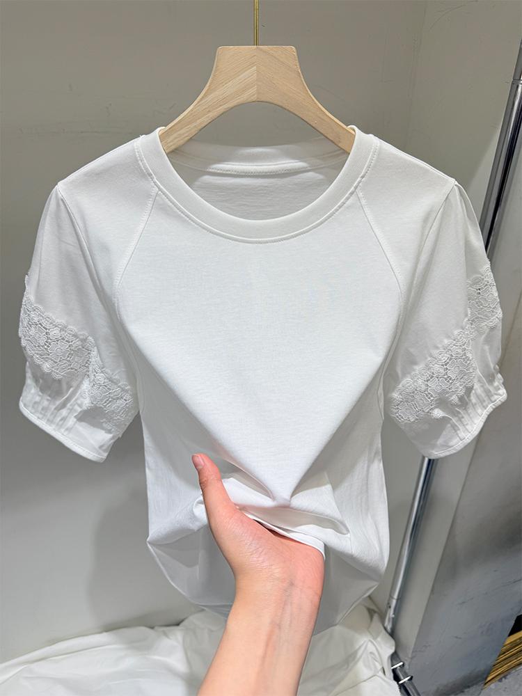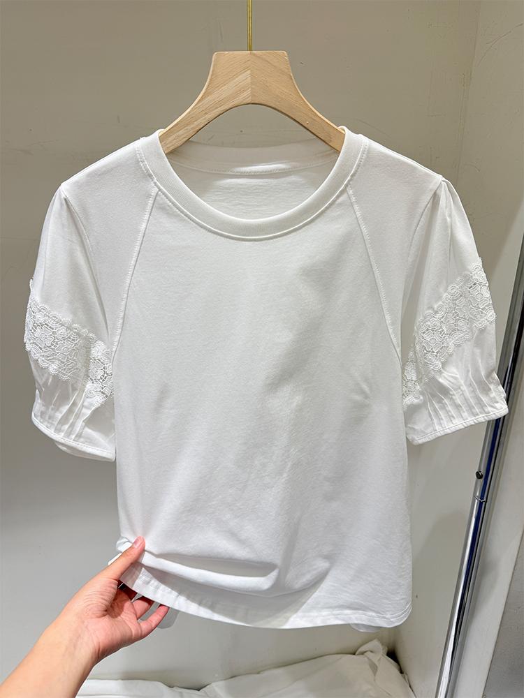 디자인센스 2025년 여름 신상 퍼프소매 다용도 라운드넥 반팔 티셔츠 나이감 감소 레이스 엣지 화이트 탑 여성용
