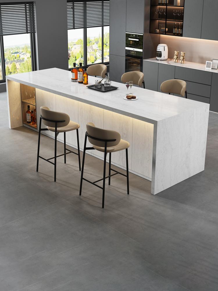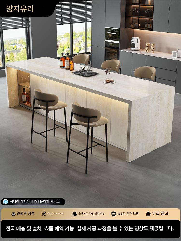 식탁이 있는 플러시 록 슬래브 트라버틴 섬 통합 주방 이탈리아 스타일 다운턴 서양식 주방 고급 바 레스토랑 가이드 테이블