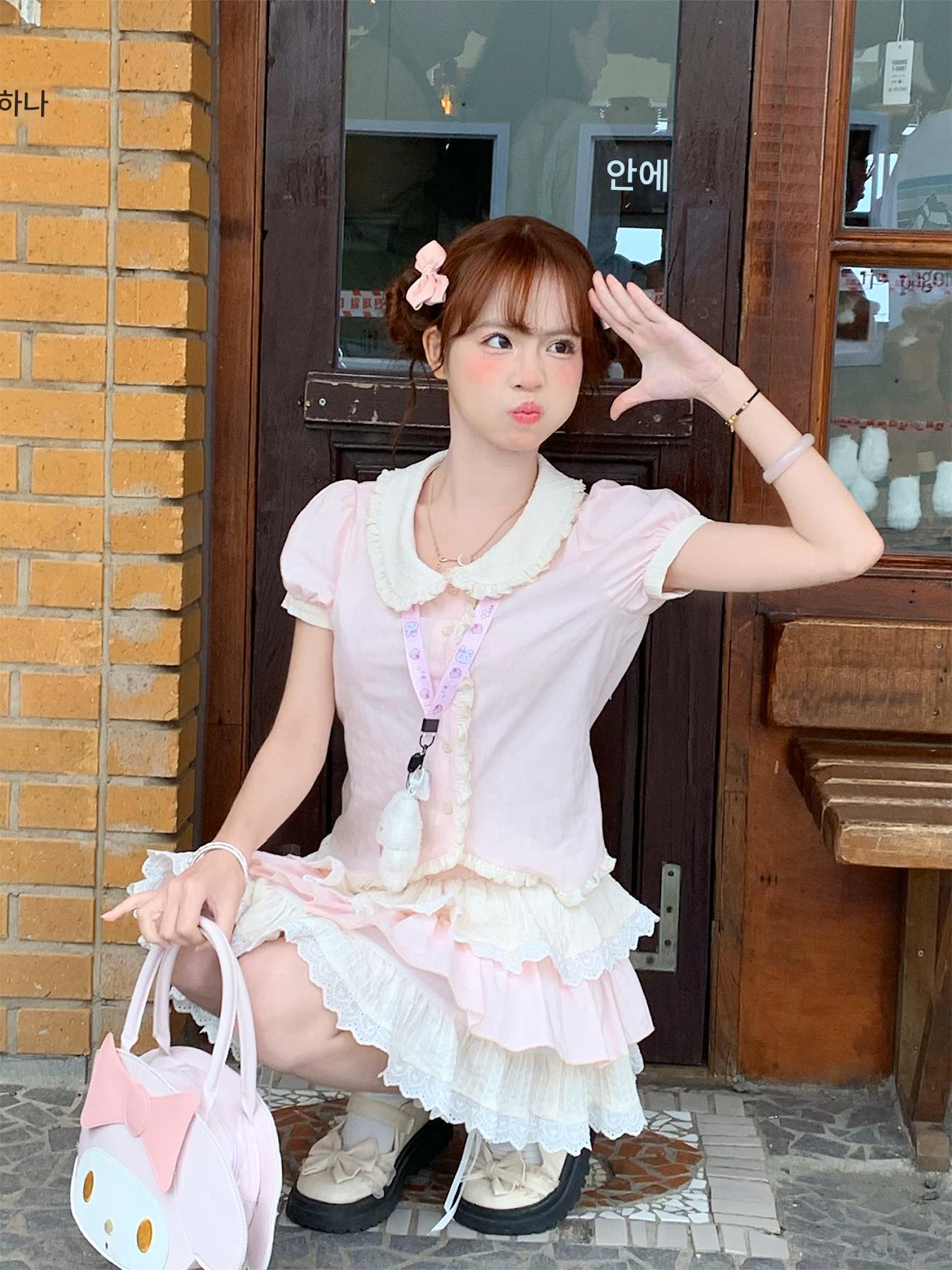 신신걸 토끼미안미안 2025 짱 예쁜 슈트 여름 핑크 히트 셔츠 + 크림 옐로우 스커트