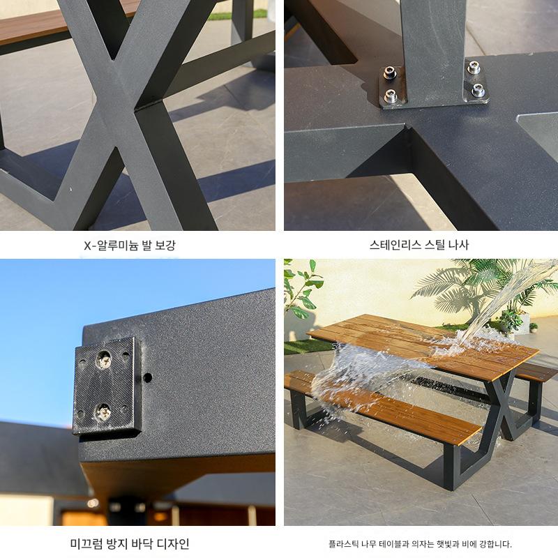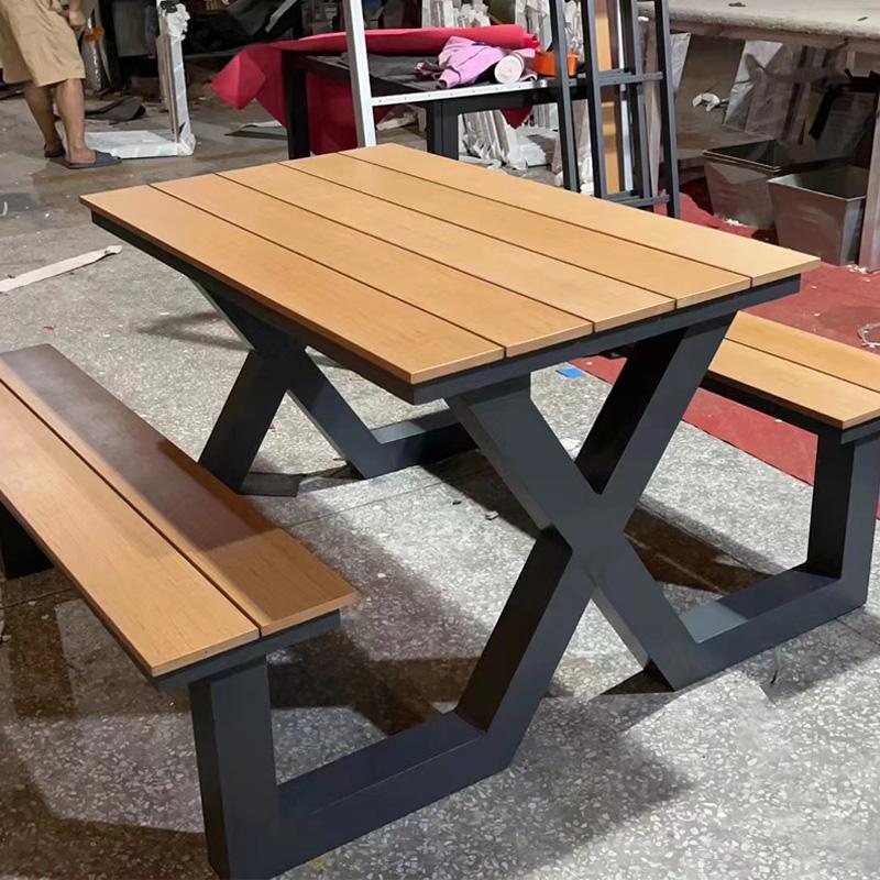 야외용 일체형 테이블과 의자 조합 공원 의자 철제 정원 안뜰 좌석 경치 좋은 지역 벤치 매칭 PE 플라스틱 나무 테이블과 의자