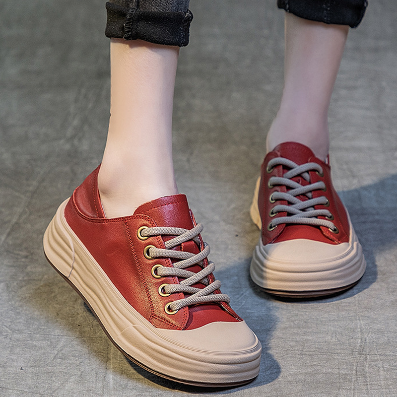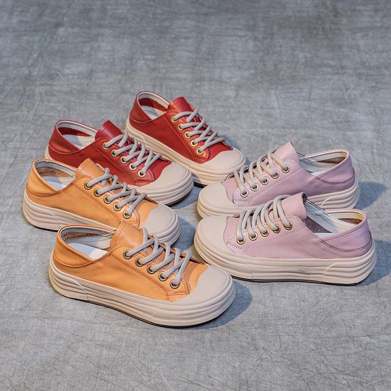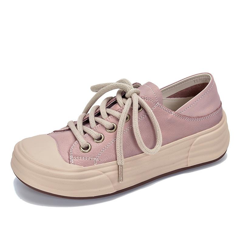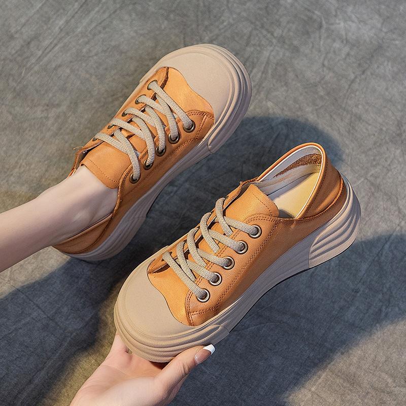 여성용 2개 착용 화이트 슈즈 2024년 봄 여름 신상 탑 레이어 소가죽 캐주얼 슈즈 보라색 라운드 투 레이스업 두꺼운 밑창 여성용 슈즈