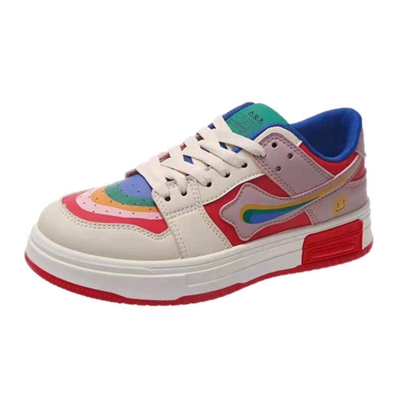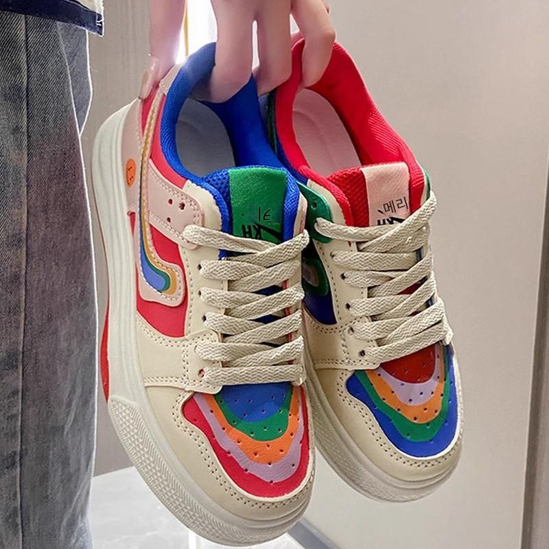 캐주얼 컬러 매칭 레인보우 만다린 덕 화이트 슈즈 여성용 2025년 신상 봄 가을 폭발적 정품 가죽 네트 셀러브리티 두꺼운 밑창 스포츠 슈즈