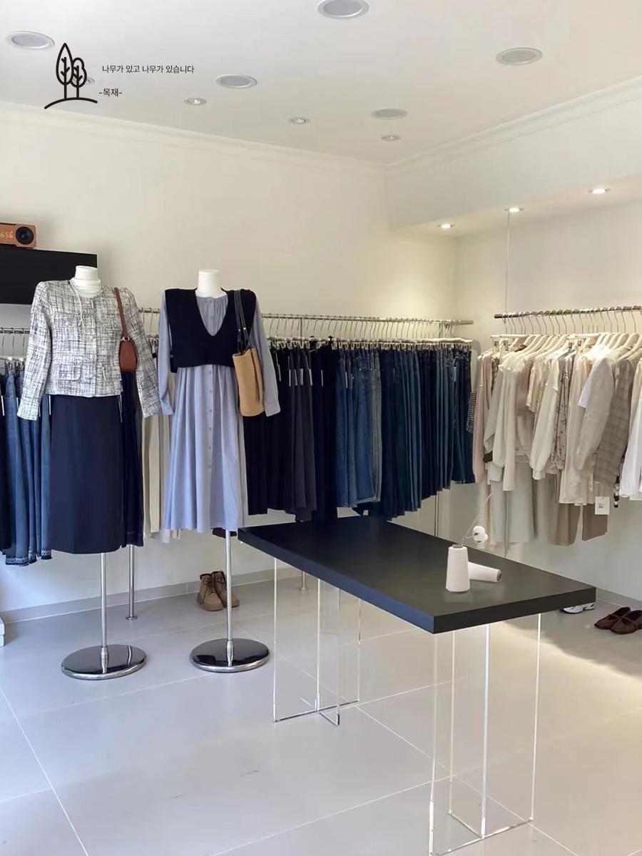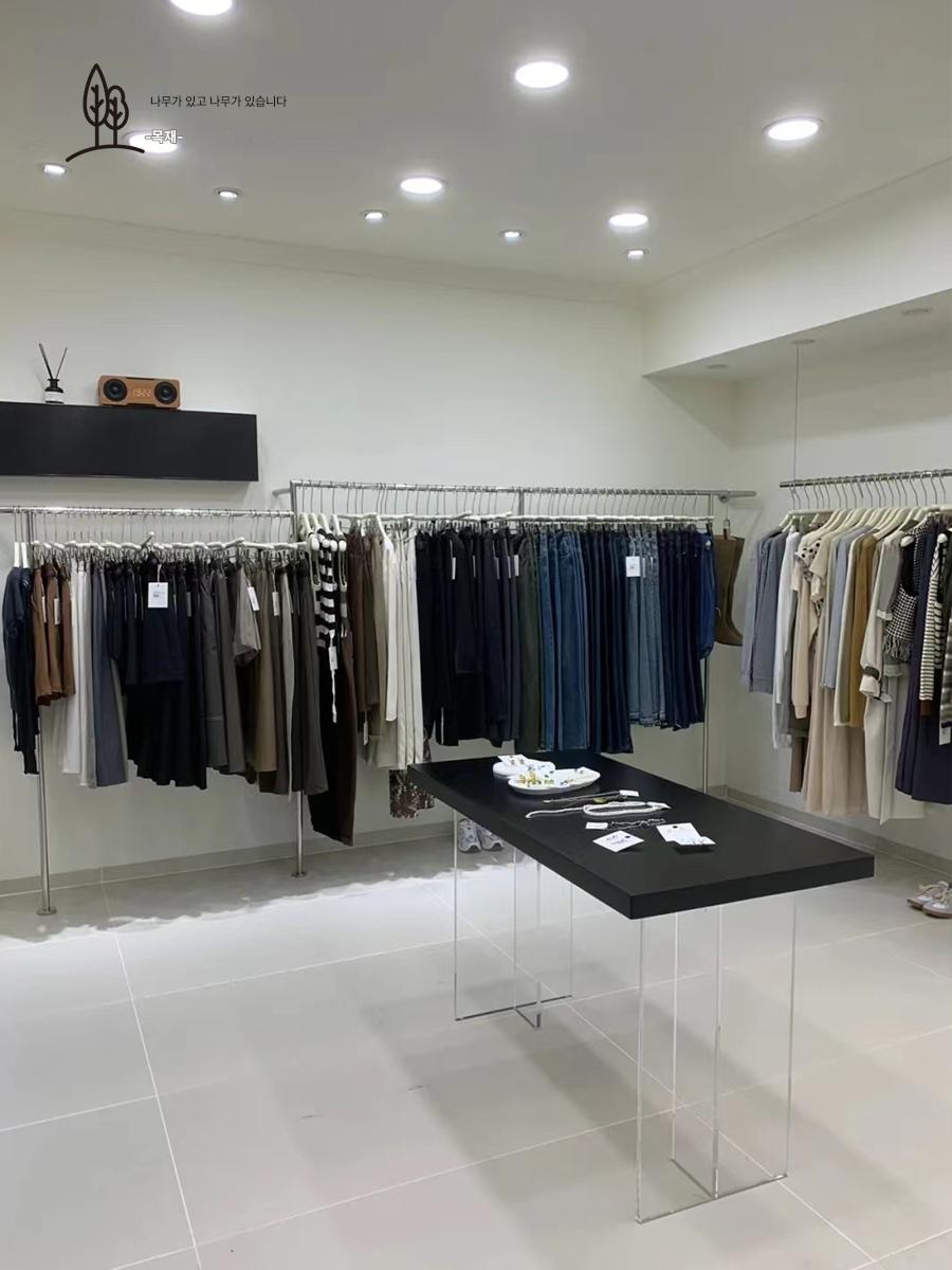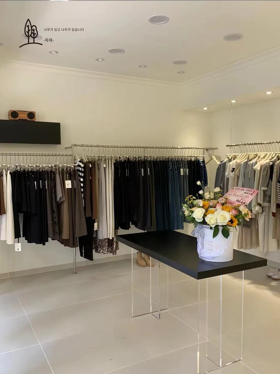 한국 의류 매장 섬 디스플레이 테이블 옷장 테이블 아크릴 다리 가운데 견고한 나무 식탁 디스플레이 테이블