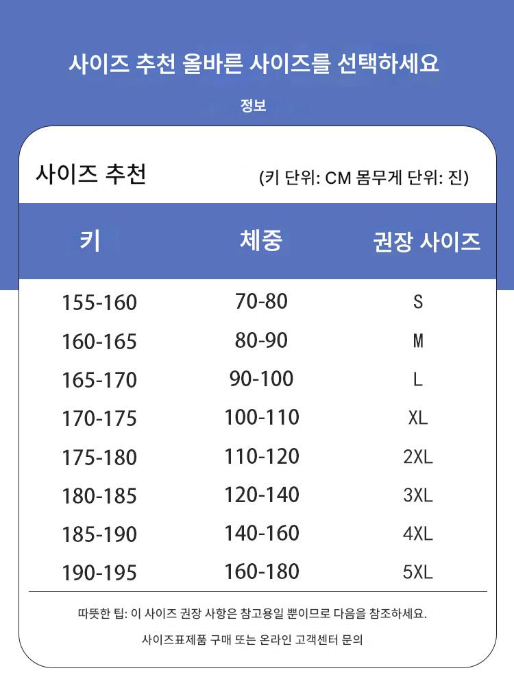 S 70 80캐티 ,M 약 80 90마리 ,L 약 90 100마리 ,XL 약 100 110캐티 ,2XL 약 110 120캐티 ,3XL 120 140캐티 ,4XL 140 160캐티 ,5XL 약 160 180캐티 |