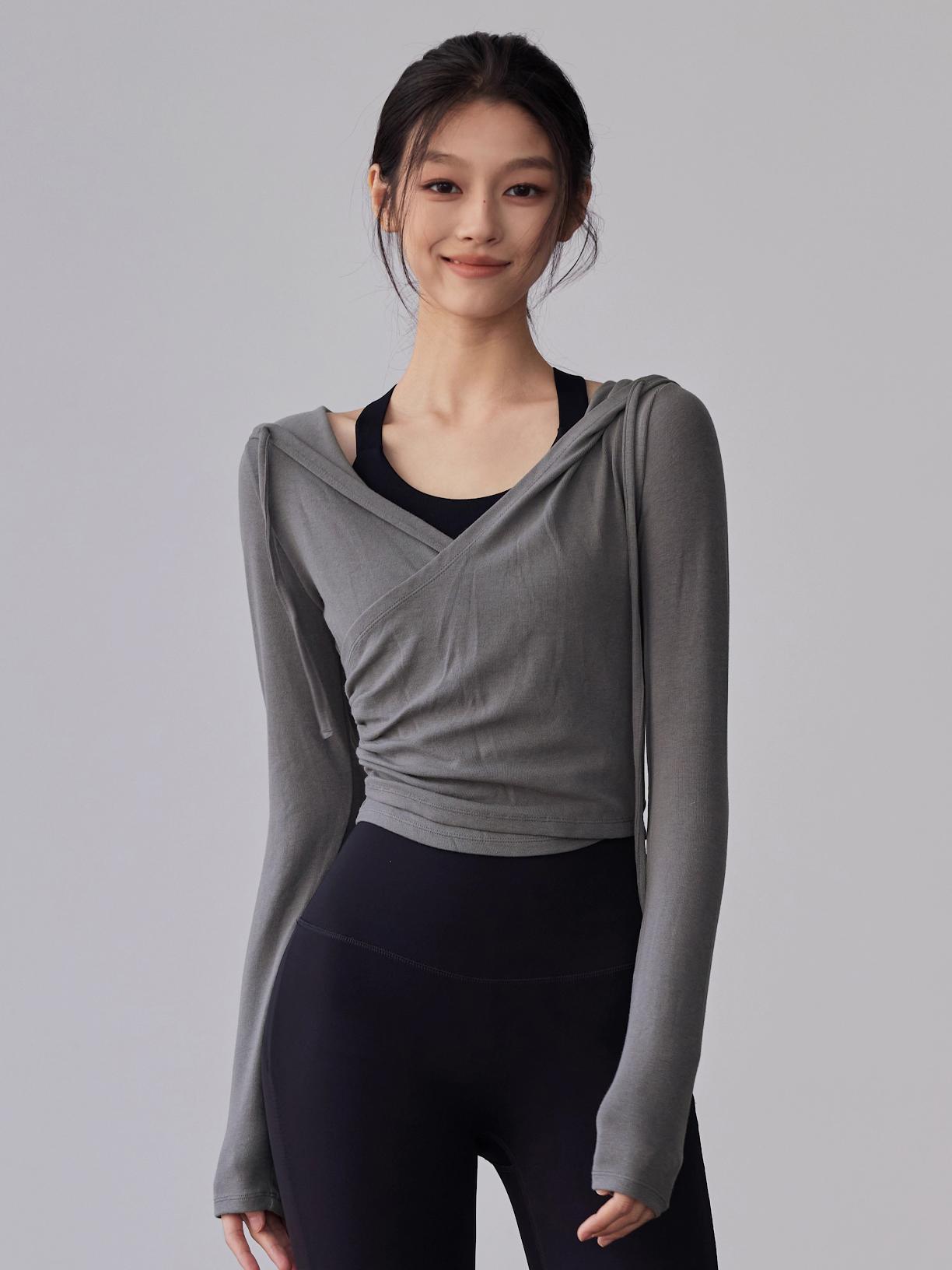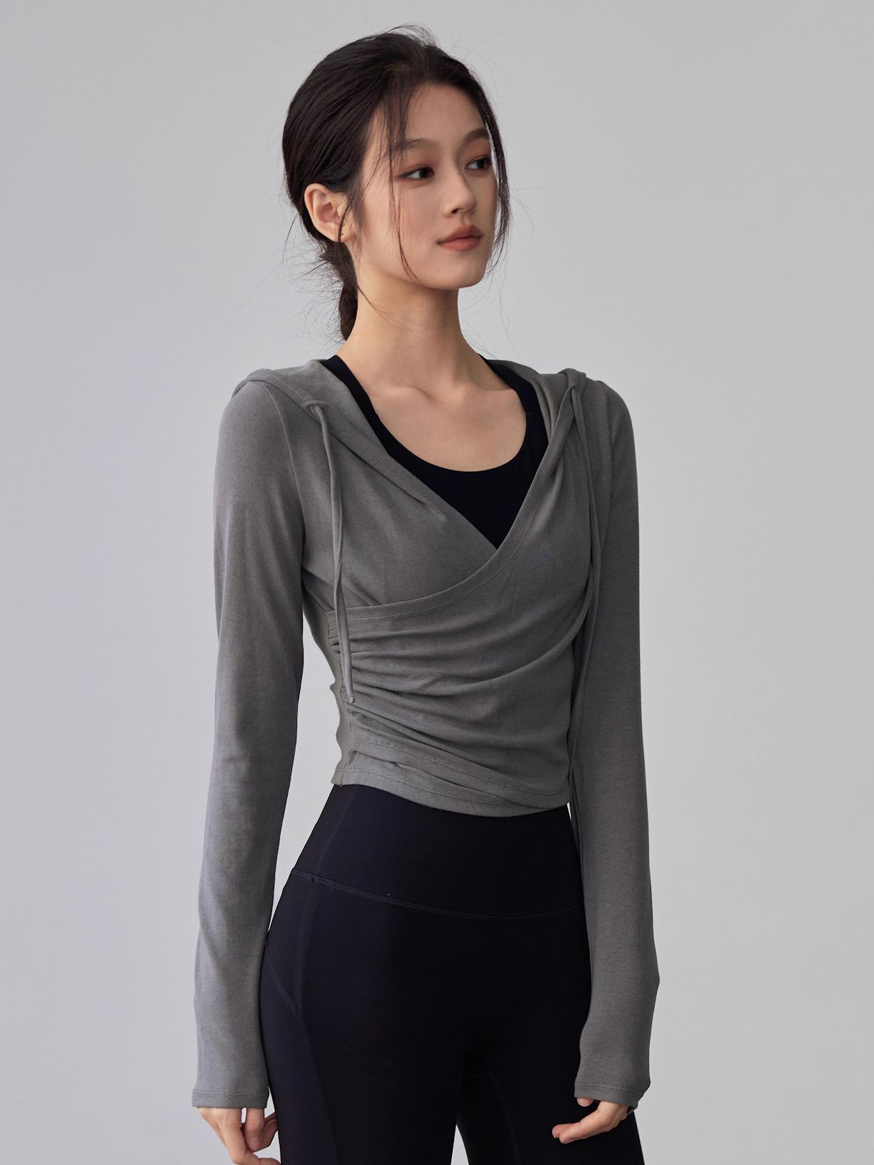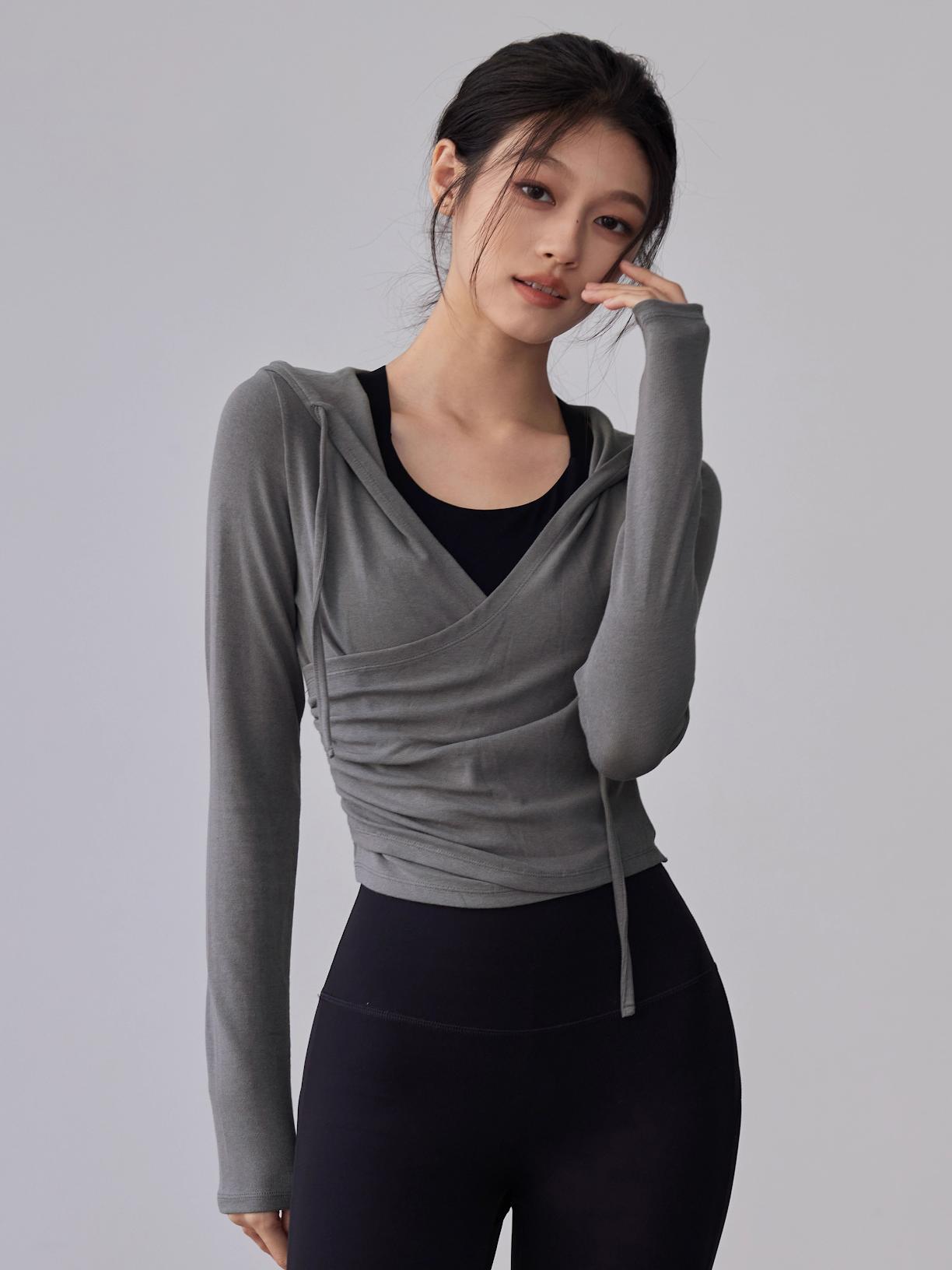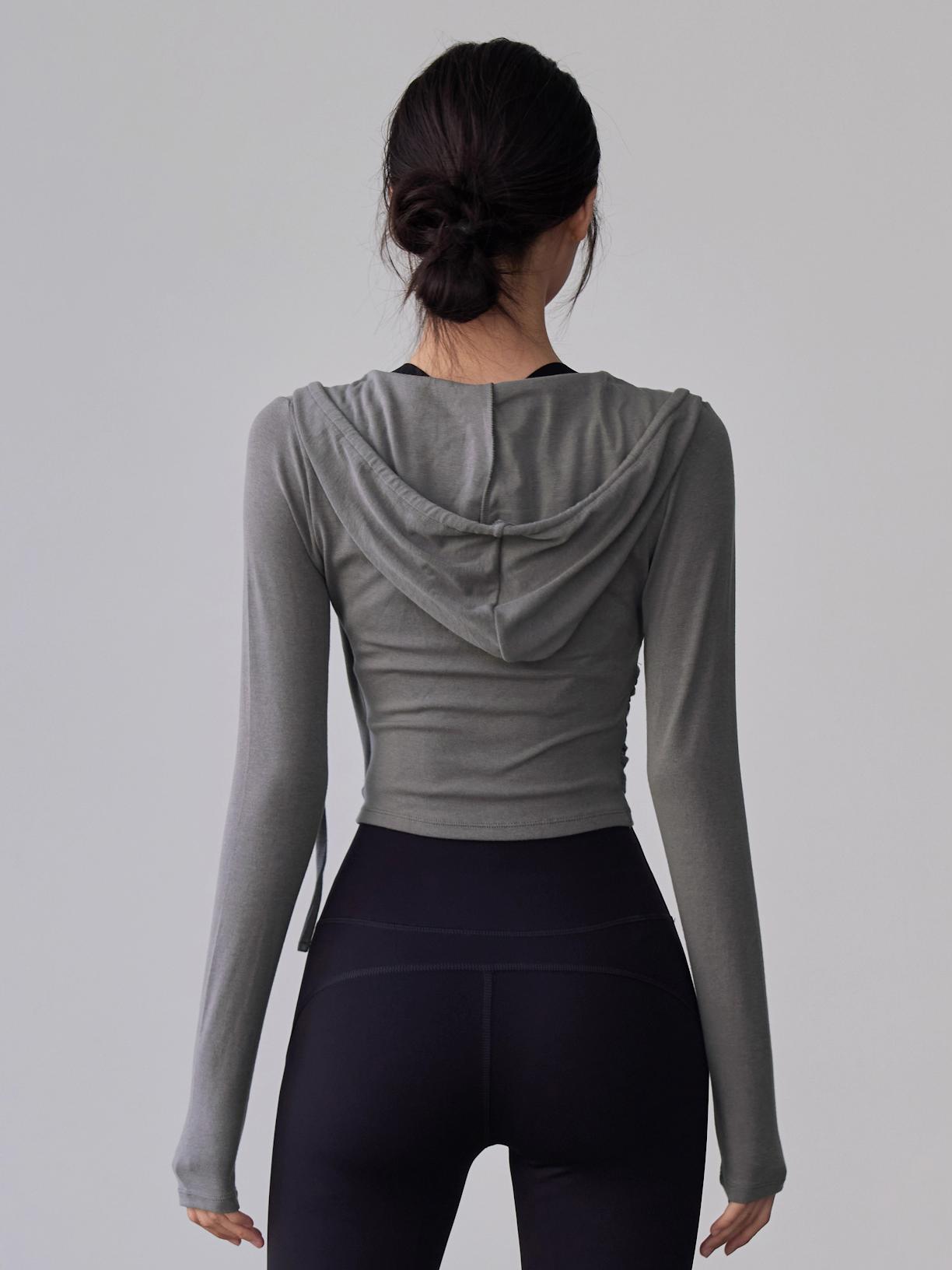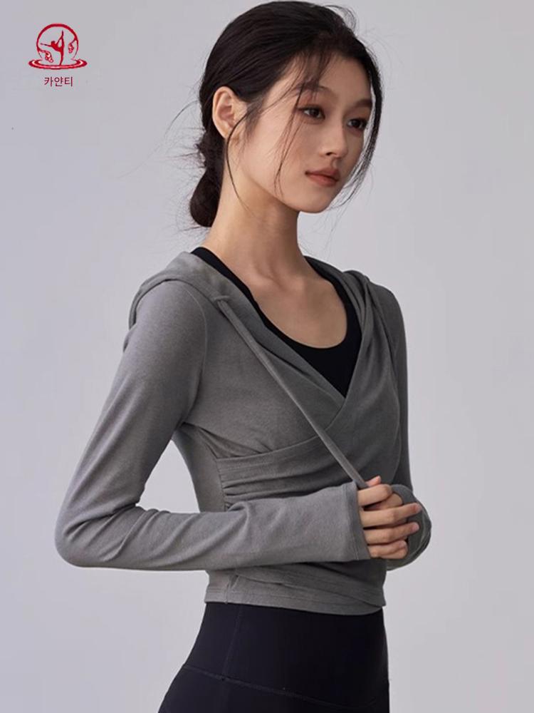 KAYANTY 가을 겨울 러닝 필라테스 타이트 롱슬리브 후드 요가복 트레이닝 V넥 허리 탑