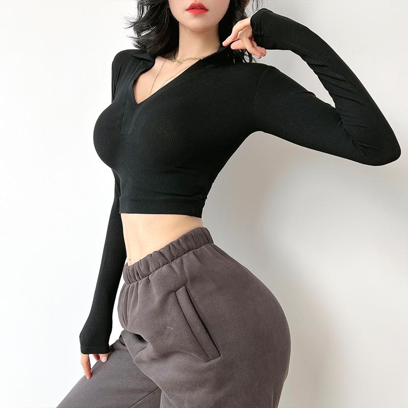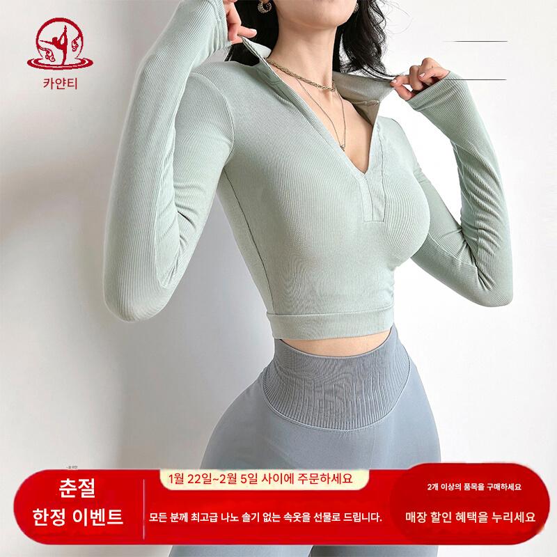 KAYANTY 스포츠 티셔츠 여성 긴팔 딥 V 탑 라펠 속건성 의류 피트니스 의류 섹시 요가 의류 가을과 겨울