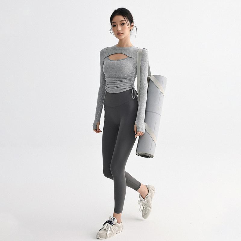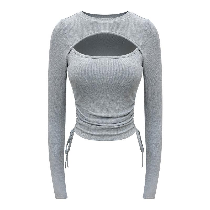KAYANTY 여성용 스포츠 상의, 가슴 패드 포함, 속건성 섹시 홀로우 필라테스 피트니스 의류, 긴팔 요가 의류